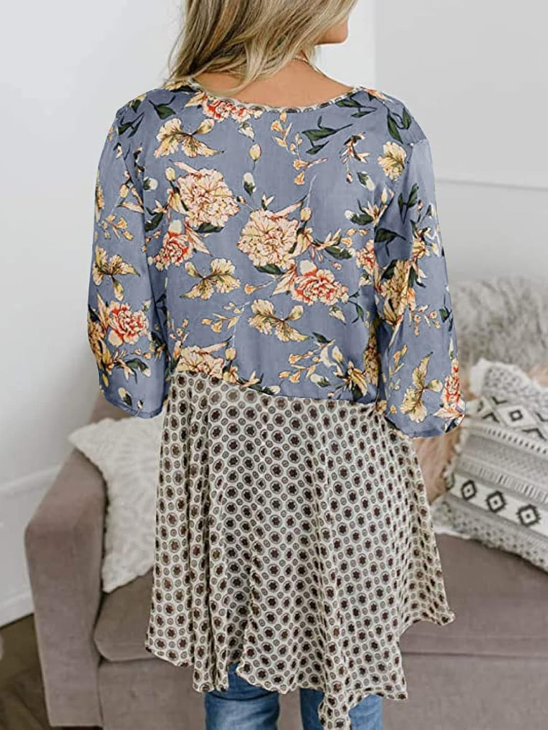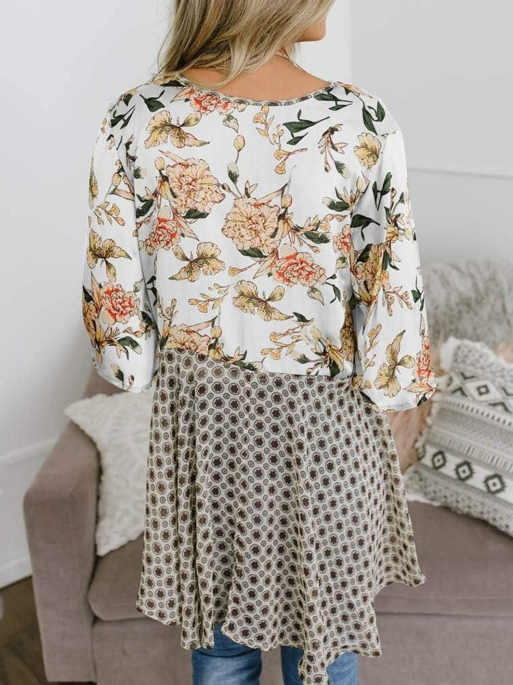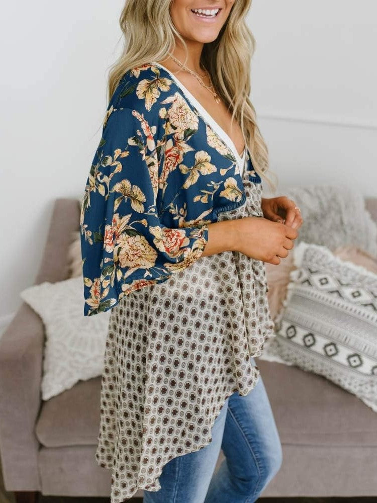 BLUMENMUSTER MIT RÜSCHÄRMELN: Halb-Rüschenärmel, Blumenmuster, Knotenverschluss vorne, High-Low-Schnitt, asymmetrischer Saum, drapierter Ausschnitt, leichtes Material, hüftlange Tunika, Patchwork-Optik mit offener Vorderseite.