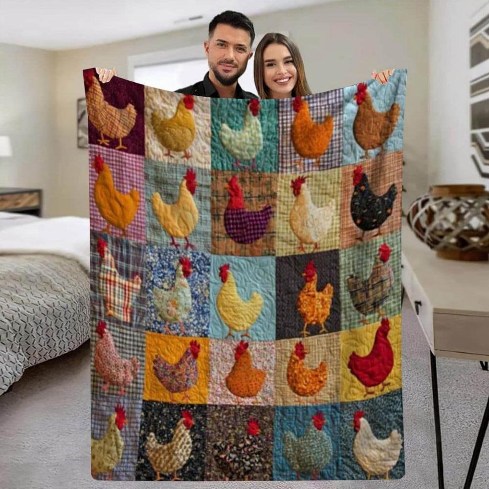 Diese kuschelige Fleecedecke hat ein süßes Hühner-Patchwork-Design, das jeden Raum sofort aufhellt.