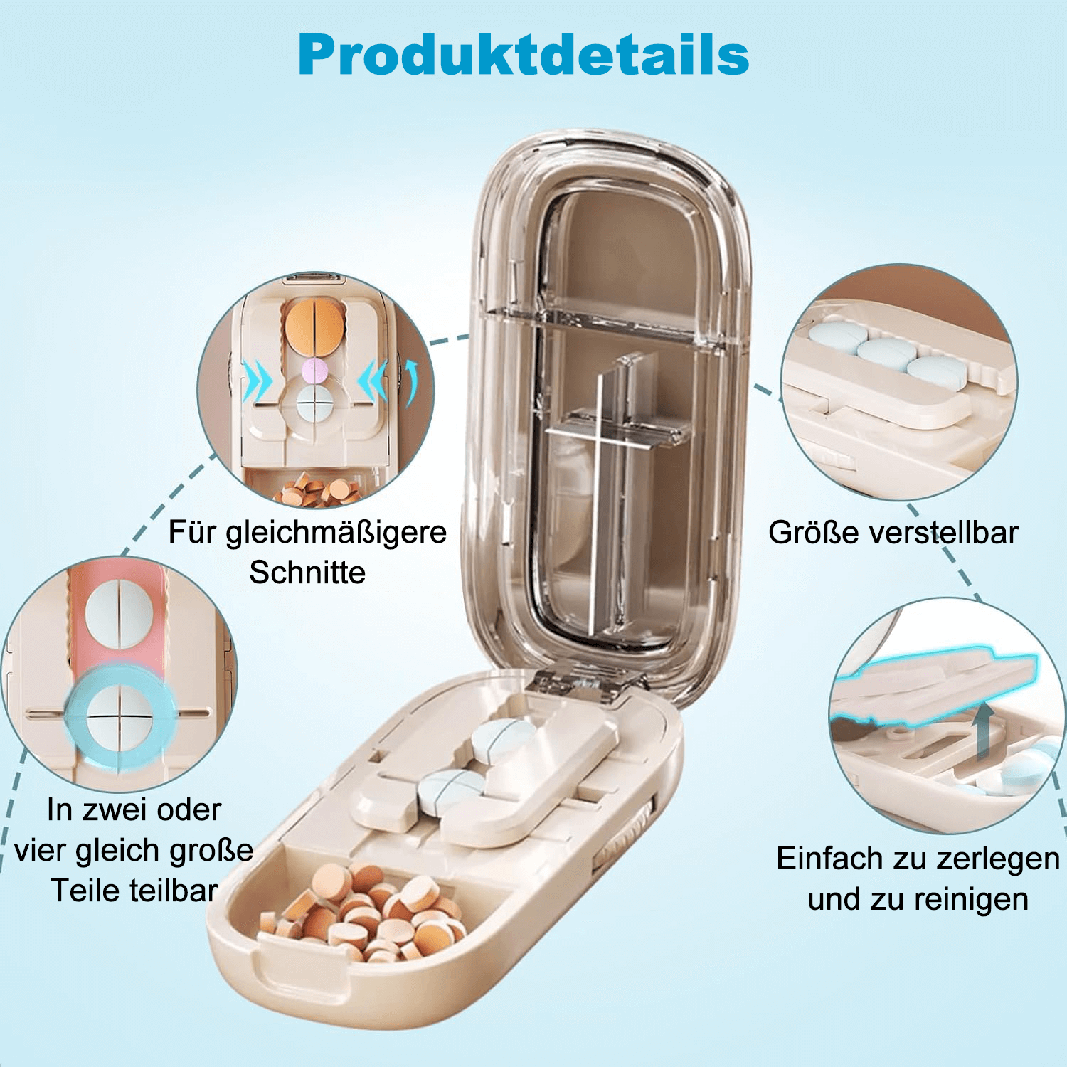 Multifunktionaler Pillenschneider - Unser Pillenteiler kann mehrere Tabletten gleichzeitig halbieren oder vierteln und spart so Zeit und Mühe. Die untere Box bietet zusätzlichen Platz für Medikamente, ideal für den Transport in Handtasche oder Rucksack.