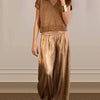 ABITO 2 PEZZI: Composto da un top girocollo a maniche corte color oro e da pantaloni larghi e lucidi, il tailleur offre un outfit coordinato completo e ti tiene aggiornato sulle ultime tendenze della moda.