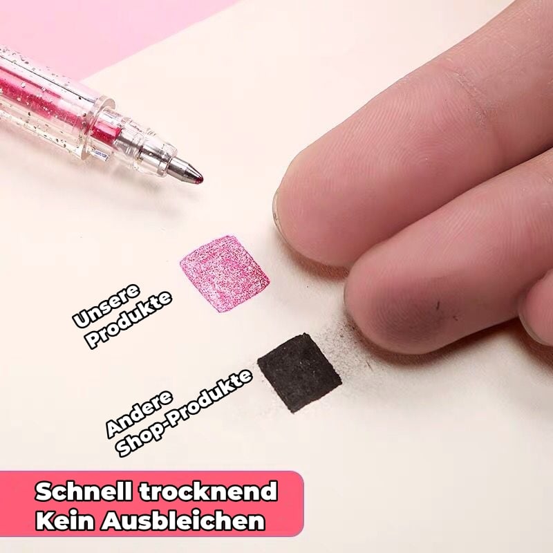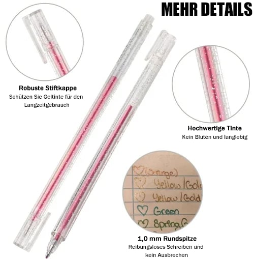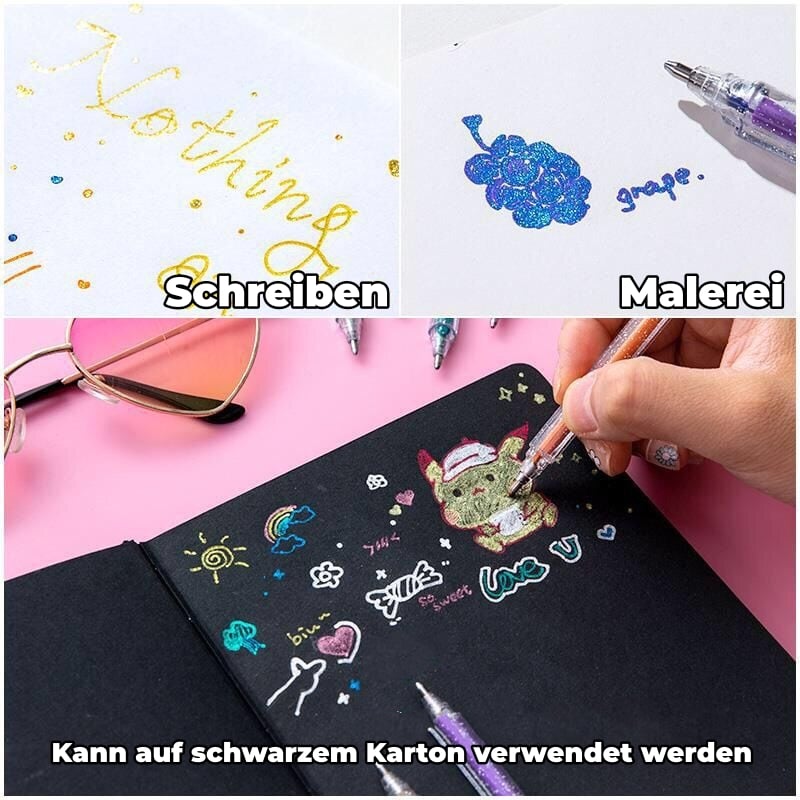 Verschmiert nicht, verblassen nicht und bleibt nicht stehen. Unsere hochwertigen glitzernden Gelpens sind großartig für Erwachsene und Kinder zum Ausmalen von Büchern, für Schulprojekte, Partyeinladungen, Grußkarten, Kritzeleien, DIY-Dekoration und Briefe an Freunde.