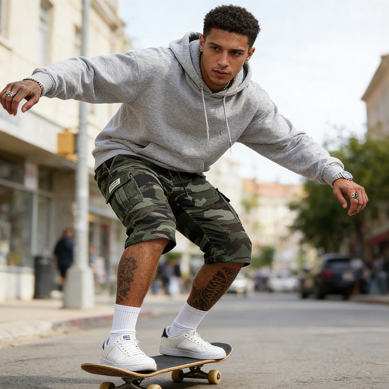 KLASSISCHER CAMO-STIL – Das zeitlose Tarnmuster verleiht Ihrer Garderobe einen Hauch von robustem, urbanem Stil. Es ist ein vielseitiges Design, das sich mühelos mit verschiedenen T-Shirts und Sneakern kombinieren lässt – für einen lässigen, modernen Look.