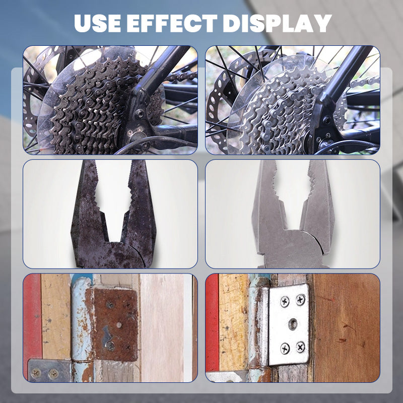 ANWENDUNG: Nach dem Aufsprühen des Rostentferners 2–3 Minuten warten. Anschließend die Stelle vorsichtig mit Schleifpapier bearbeiten, um den Rost zu entfernen. Das Produkt ist nicht korrosiv und beschädigt das Werkstück nicht.