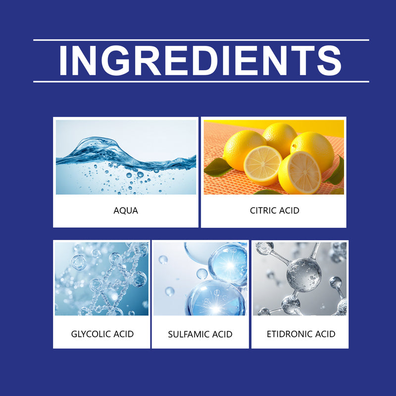 Hauptinhaltsstoffe: Wasser, Zitronensäure, Amidosulfonsäure, Glykolsäure, Hydroxyethylidendiphosphonsäure