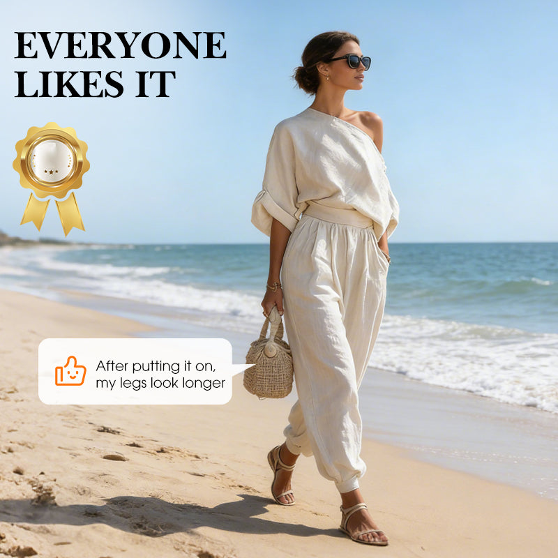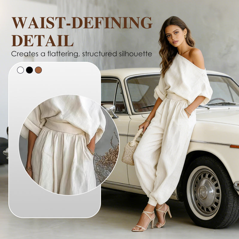 ASYMMETRISCHER EINZELN SCHULTERFREIER AUSSCHNITT – Verleiht einen modernen, raffinierten Look, der das Schlüsselbein elegant betont. Dieses schicke Detail wertet das lässige Set auf und macht es sowohl für Tagesausflüge als auch für Abendveranstaltungen geeignet, wobei es mühelos Eleganz ausstrahlt.