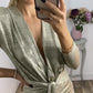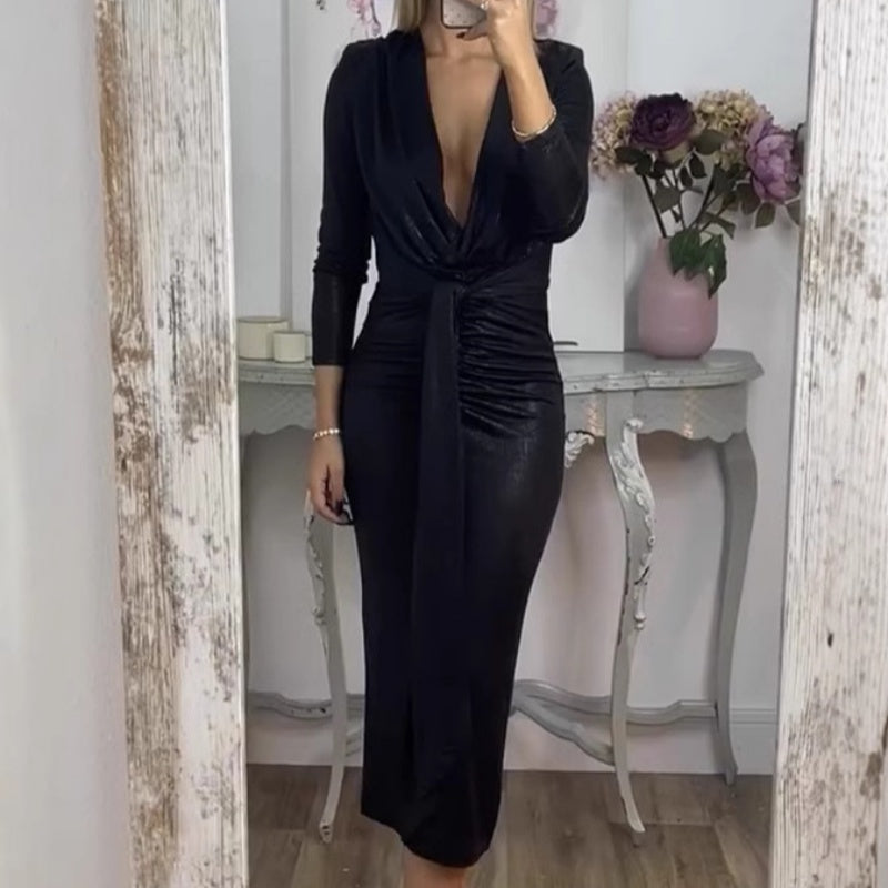 Metallic-Langarm-Krawatten-Bodycon-Kleid mit V-Ausschnitt