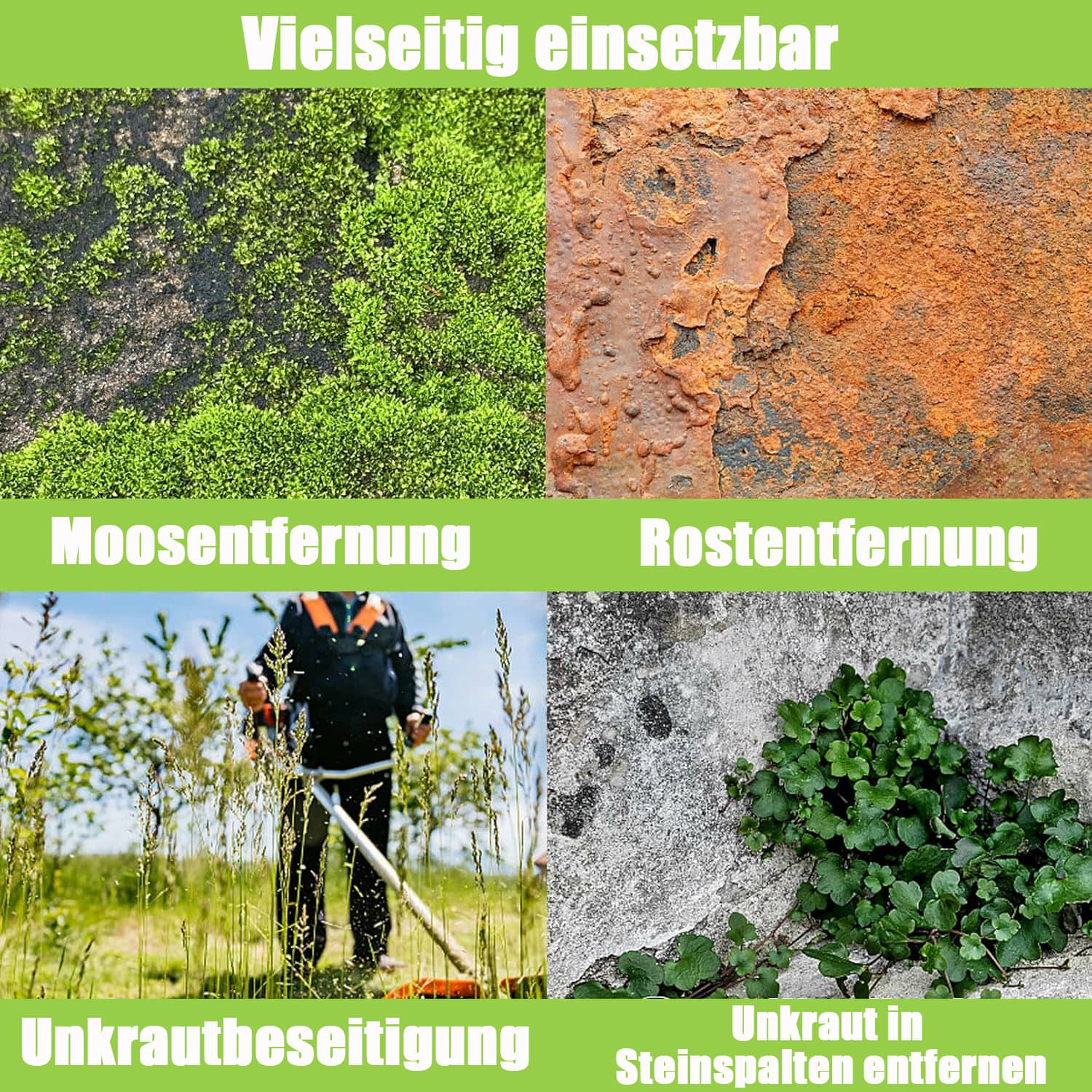 Der Trimmerkopf mit Stahldraht eignet sich zum Rasenmähen, insbesondere zum Entfernen von Unkraut in Ecken oder zwischen Ziegelsteinen, zum Reinigen von Moos auf Gehwegen und zum Jäten von Unkraut auf Sand und Kies. Er kann auch zum Entfernen von Rost und Moos , zum Reinigen von Böden und zum Jäten von Unkraut in Gärten , auf Gehwegen , in Höfen , auf Parkplätzen usw. verwendet werden.
