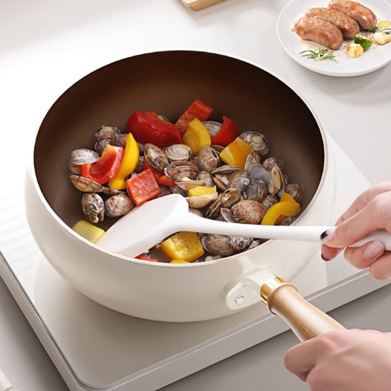 Langlebige Titan-beschichtete Oberfläche lässt Speisen mühelos gleiten – mit weniger Öl. Erleichtert sowohl das Kochen als auch die Reinigung, da Rückstände sich mühelos abwischen lassen.