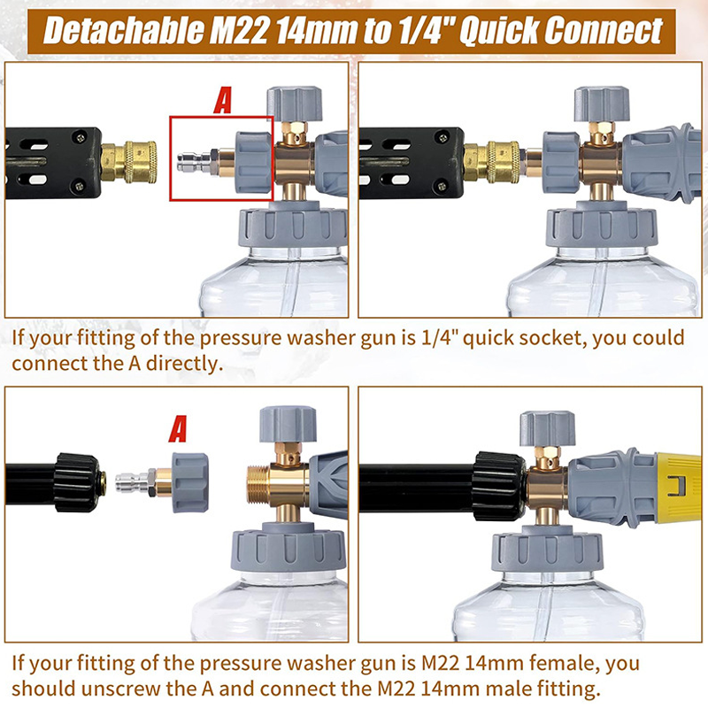 UNIVERSAL-SCHNELLKUPPLUNG – Ausgestattet mit einer standardmäßigen 1/4-Zoll-Schnellkupplung und einem mitgelieferten M22-14-mm-Adapter lässt sich diese Schaumkanone problemlos an einer Vielzahl von Hochdruckreiniger-Pistolen befestigen und sorgt für eine sichere und leckagefreie Verbindung.