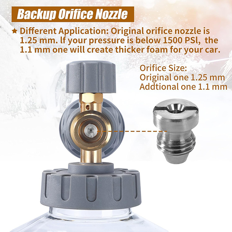 DUAL-DÜSEN – Mit vorinstallierter 1,25-mm-Düse und zusätzlicher 1,1-mm-Düse. Damit können Sie die Schaumleistung für Ihren speziellen Hochdruckreiniger optimieren und selbst bei Geräten mit niedrigerem Druck eine maximale Schaumdicke erzielen.