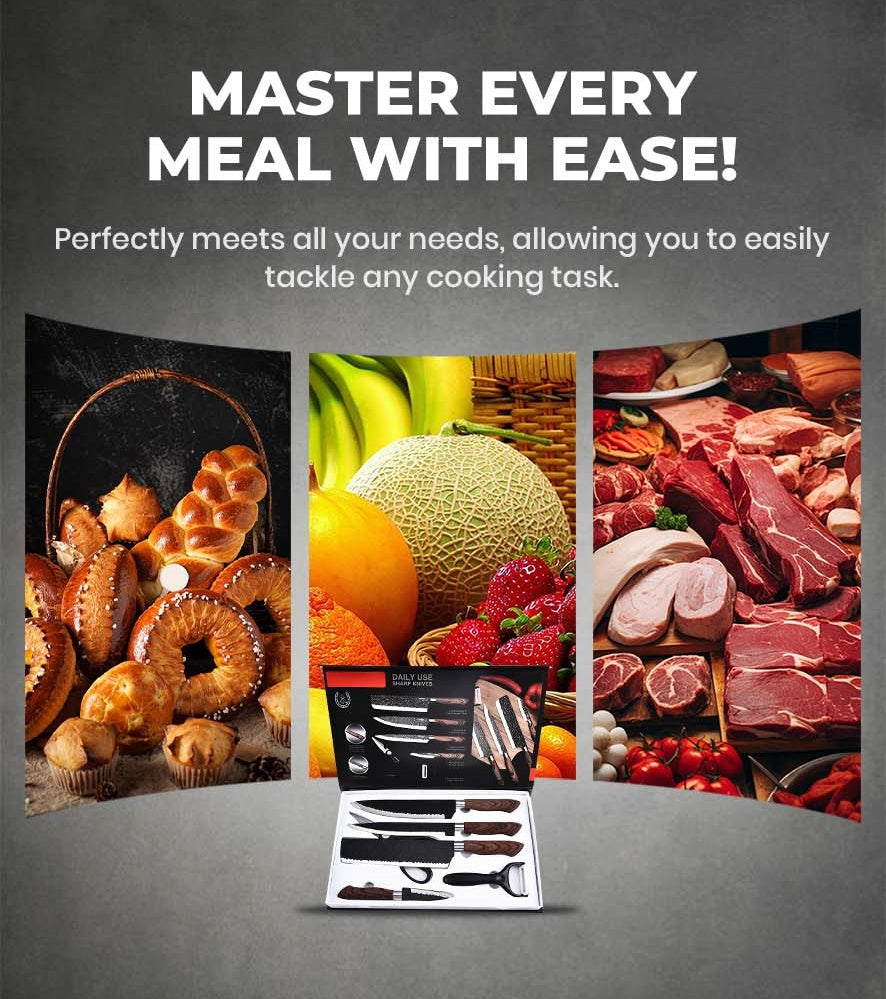 6-TEILIGES SET – Dieses umfassende Küchenmesserset enthält ein Kochmesser, ein Fleischmesser, ein Schälmesser, ein Allzweckmesser, eine Küchenschere und einen Schäler. Es ist perfekt für alle Ihre kulinarischen Bedürfnisse geeignet und rüstet Sie mühelos für jede Kochaufgabe.
